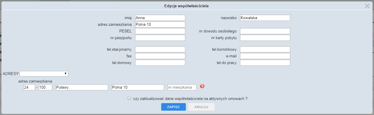 Po dodaniu współwłaściciela do bazy danych, jeśli mamy potrzebę zmienić informacje dla istniejącego współwłaściciela to używamy mechanizmu edycji.