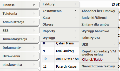 - Klienta z zaległościami według jego salda można wyszukać wybierając z menu: Finanse->Zestawienia->Klienci/Saldo