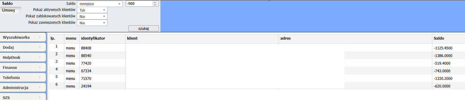 (dane w kolumnach klient i adres wymazane by nie wyświetlać danych RODO)